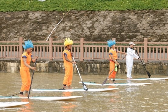 蒙蒙细雨中,七仙河面泛起阵阵涟漪。来自俄罗斯、法国、巴西等多个国家的桨板爱好者身穿精美的黎族苗族传统服饰,成为2025年七仙温泉嬉水节中最动人的风景。这些国际参与者不仅主动换上民族盛装,更认真学习了基础桨板划行技巧,在河面上形成了一支跨越国界的文化使者队伍。