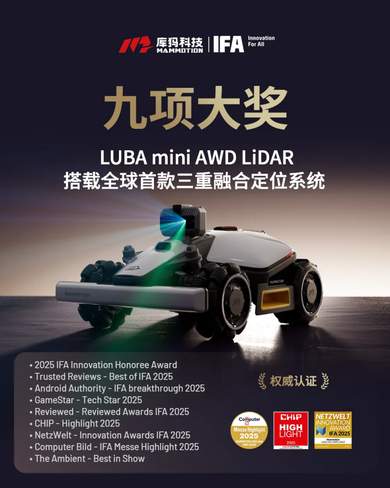 2025年9月8日,智能庭院机器人先锋品牌库犸科技(MAMMOTION)在IFA 2025展会上,凭借领先的技术实力与设计理念,一举包揽了10余项权威媒体与行业奖项,成为本届IFA展会获奖最多的割草机器人品牌,充分彰显库犸科技在自主庭院机器人护理领域的领导水平。