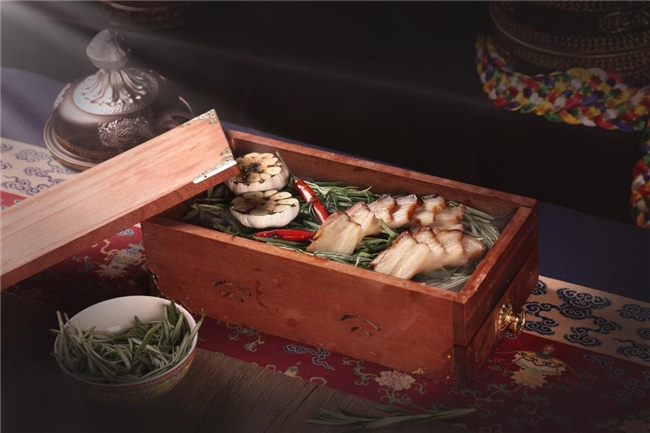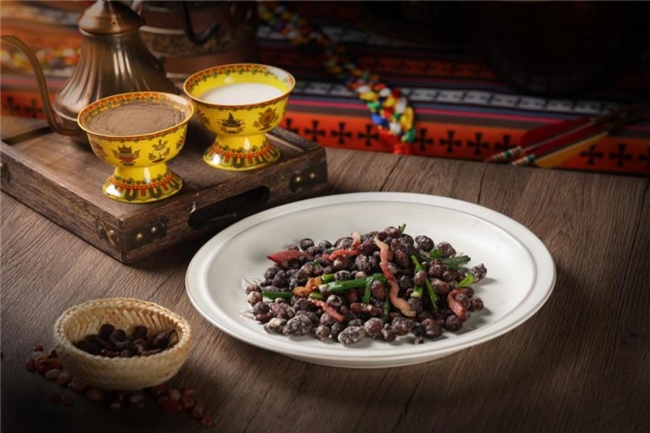 餐桌上不仅摆放着传统的藏餐风味,还新增了藏式和西式创新融合菜品,如:蕨麻金穗·肉丝拌粮,馓子云卷·炒牛胸膘,松烟秘境·碳烤五花烟豚肉等以及清新的精品手抓,卓玛哲斯,馓子,酸奶,包子,熬茶,水果等。三道菜的做法与寓意分别为:1蕨麻粉与青稞醋炒牦牛肉丝,撒曲拉碎粒,寓意河谷秋收时满地金穗翻滚的丰饶景象。2酥脆馓子与牦牛胸标合炒,饰以高原野葱,形如黄河之上云卷云舒,酥香交融。3松针熏制高原猪肉配夏卜钦野菜,雾气缭绕如坎布拉森林秘境,暗藏林间鲜香。