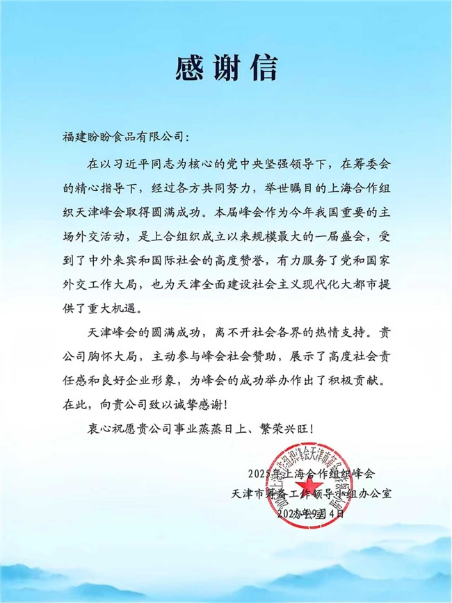 随着2025年上合组织峰会的召开,盼盼食品将再次向世界展示中国食品工业的发展成就。盼盼食品一次次代表中国食品品牌站在国际舞台中央,向世界传递中国美食文化,彰显中国品质自信。未来,盼盼食品将继续为全球消费者提供"绿色、健康、营养、时尚、方便、放心"的食品,让世界共享中国味道。