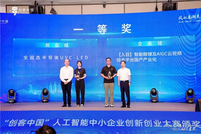 经过多轮严格评审与激烈角逐,本届大赛各奖项得主尘埃落定。“全固态半导体UVC-LED”项目和“【入目】智能眼镜及AIGC云视频综合平台国产产业化”项目分别获创业组、企业组一等奖。工业和信息化部网络安全产业发展中心(工业和信息化部信息中心)总工程师王俊峰,南湖区委副书记、区长王志军为“桂冠”选手颁奖。