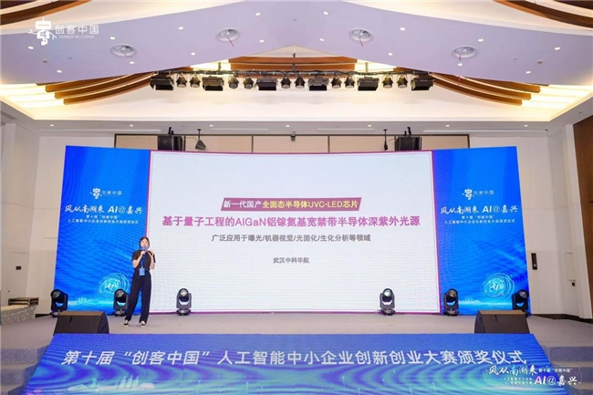 “全固态半导体UVC-LED”项目则聚焦紫外LED芯片技术创新,通过自主研发氮掺杂三元结构材料,实现13%的电光转换效率,达到全球领先水平。项目联合创始人王敏琦介绍,该项目构建了从外延材料到封装模组的全产业链体系,产品可有效替代传统汞灯,实现零汞污染、高集成度的技术优势。目前已在工业曝光、医疗光疗、白色家电除菌等领域广泛应用。