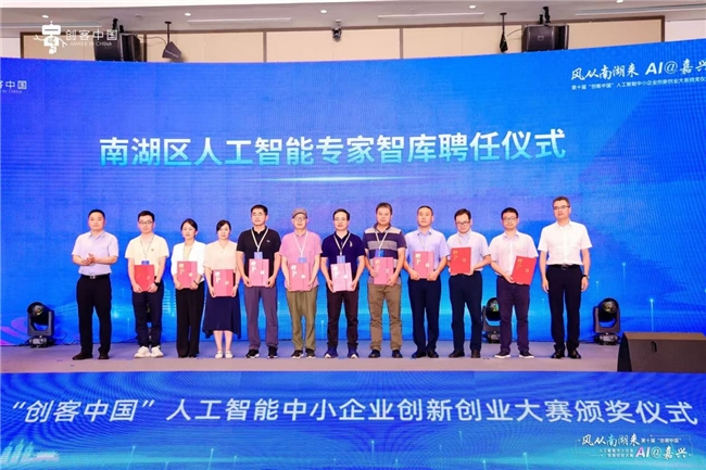 为推动南湖区人工智能产业高质量发展,大赛现场正式成立了南湖区人工智能专家智库,南湖区委常委、副区长徐刚等为10位评审专家颁发聘书。