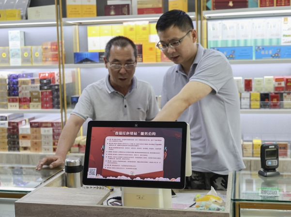 图为刘新智(左)和烟草公司客户经理一起通过双屏机分析店铺经营情况