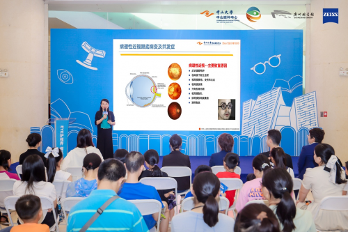 中山大学中山眼科中心屈光与青少年近视防控科主任、广东省近视防控专家宣讲团成员杨晓教授进行《书海视界 健康阅读》分享。她以欢乐有趣的互动为大家解密眼睛的发育进程,呼吁家长为孩子尽早建立屈光发育档案,密切关注孩子视力的发展。同时,她特别提醒,畅游书海是近距离的用眼场景,更要科学保护视力。建议为孩子营造温馨、光线适宜的阅读环境,保证阅读姿势正确,敦促孩子每日有充足户外活动时间,以科学的方式,更好守护视力健康。