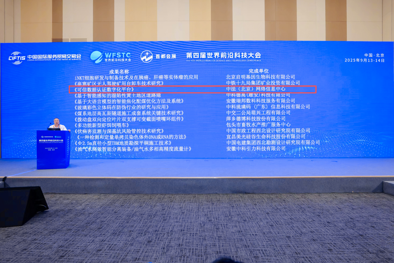 本届大会以“突破关键技术壁垒、构建全球创新生态”为核心,遴选出了一批引领行业变革的标杆性成果。其中,中法(北京)网络信息中心申报的并独家拥有知识产权的“可信数据认证数字化平台:人工智能推动新质生产力高质量发展成果”,经相关院士与专家审核评比,最终成功入选大会发布的“各领域可产业化项目”案例,成为数据要素领域彰显中国科技实力的亮眼代表。