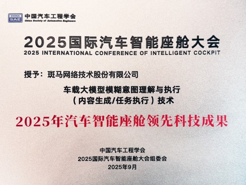 近日,斑马智行全栈自研的车载大模型模糊意图理解与执行技术,荣获中国汽车工程学会2025年汽车智能座舱领先科技成果奖。