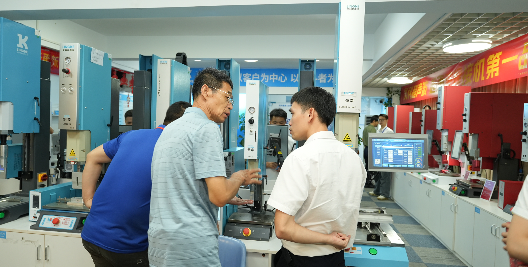 技术研讨环节由产品经理叶经理主持,他深入解析了伺服焊接技术的领先性能,并针对家电、打印耗材、医疗、汽配等前沿行业的应用难题,分享了灵科超声波的创新解决方案,现场反响热烈。随后,嘉宾在工程师的指导下,零距离操作多款超声波伺服焊接设备,切身感受灵科设备在智能化、稳定性和易用性方面的优越表现。