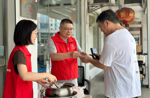 “大哥,这杯百合绿豆汤是我们早上刚熬的,没额外加糖,您快喝了解解暑!”“香溢”志愿者范磊熟练地将冰镇凉汤递到外卖员王军手中,还不忘附上一包藿香正气胶囊,反复叮嘱“天热跑单别中暑,不舒服了及时用”。