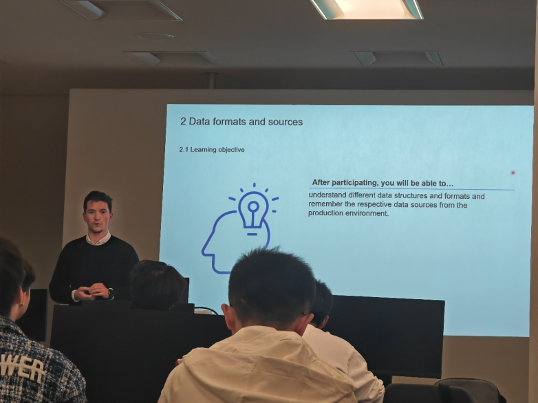 访学课程由慕尼黑工业大学的多名教授共同讲授,内容涵盖“工业具身智能”“人工智能网络物理系统方法”“数字工艺流程设计(CAD)和数字孪生”“物联网传感器”“计算机视觉”“物联网云平台和数据共享”等。在教授们细致入微的指导下,同学们不仅扎实掌握了理论知识,更积极投身实践环节,熟练运用 Python 等相关编程工具编写代码,通过实操练习深化对知识的理解与应用。课程结束后,大家以小组为单位开展项目成果汇报。各小组围绕遇到的不同具体问题,有针对性制定解决方案,顺利实现了课堂抽象理论知识向解决实际需求的具体实践应用的转化,利用Python 等编程工具生成数据表格与可视化图像,助力听众高效开展数据分析和评估工作。