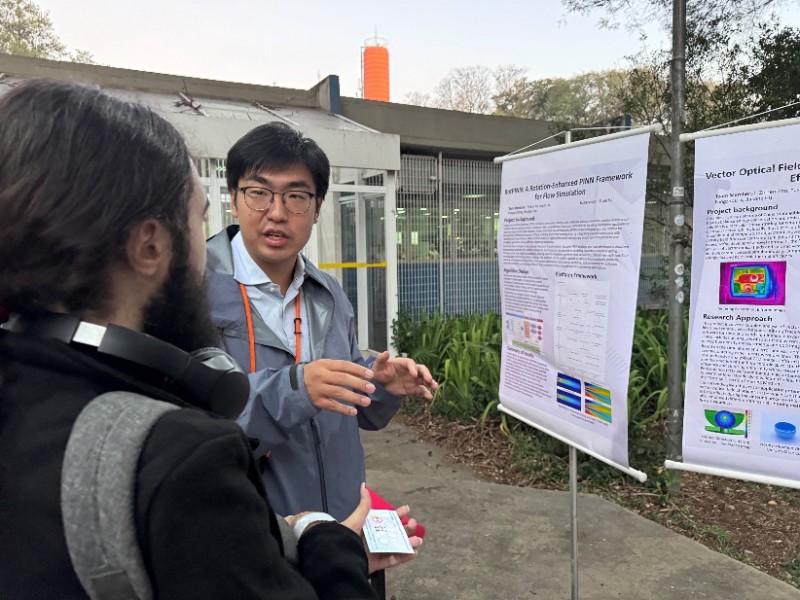 离开研究所后,支队在圣保罗大学食堂外举办了“科创+中华文化”路演活动。支队成员通过科创作品海报展示、非遗技艺互动体验等环节,向巴西师生介绍清华大学本科生在清洁能源利用和数理基础科学等领域的科研科创作品,同时分享中国结、投壶与剪纸文化的魅力。还有许多巴西同学被书法体验吸引,纷纷用毛笔写下自己的中文名字,现场气氛热烈而友好。