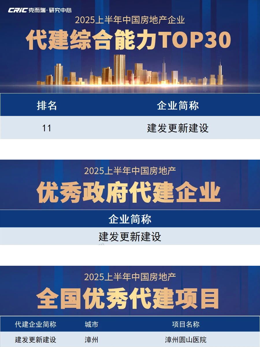 9月17日,克而瑞研究中心发布备受业界瞩目的“2025上半年中国房地产企业代建综合能力TOP30”排行榜,建发更新建设荣登榜单TOP11,并荣膺“2025上半年中国房地产优秀政府代建企业”称号,其代建项目漳州圆山医院同步斩获“全国优秀代建项目”殊荣,实现企业综合实力与标杆项目品质的双重认可。