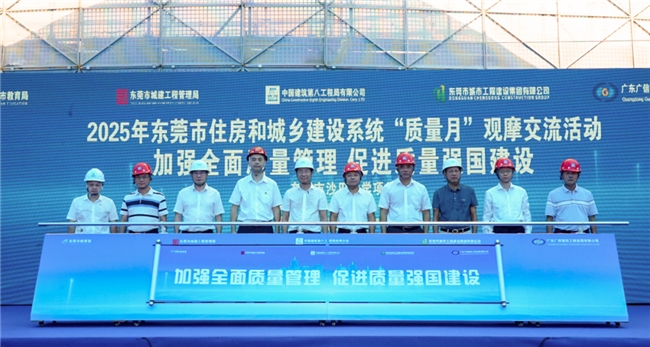 在第48个全国“质量月”到来之际,为贯彻落实东莞市住房和城乡建设局住建系统2025年“质量月”活动安排,持续完善工程质量保障长效机制,深化质量易发问题整治,推动建筑工程品质提升,9月18日,2025年东莞市住房和城乡建设系统“质量月”现场观摩交流会走进中建八局与东莞市城市工程建设集团有限公司联合承建的东莞市湾区中学项目,东莞市住房和城乡建设局、城建工程管理局、沙田镇政府、中建八局、东莞城市工程建设集团有限公司相关负责人,市相关部门、建筑行业代表等共计300余人参加,线上观摩累计超1.7万人次。