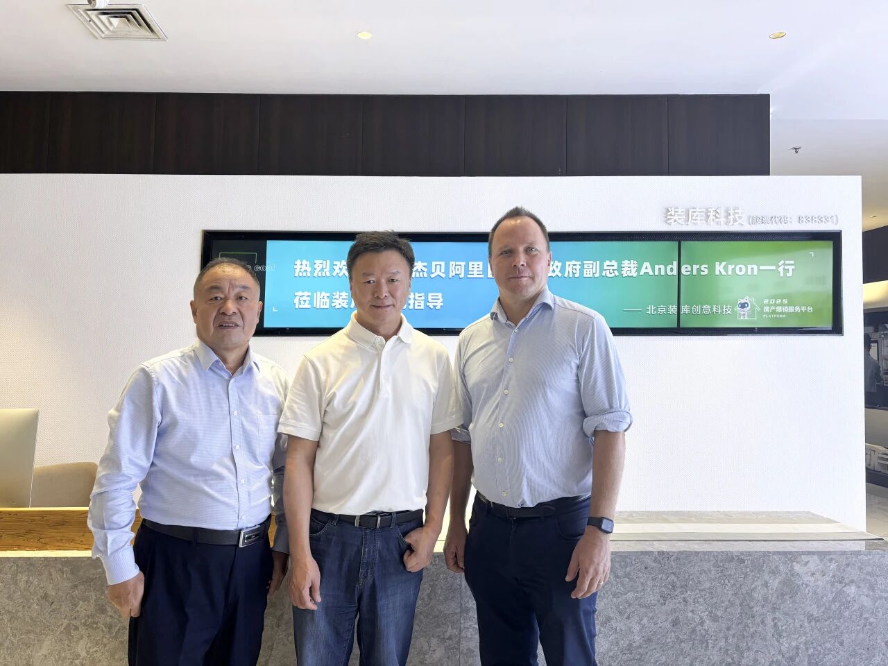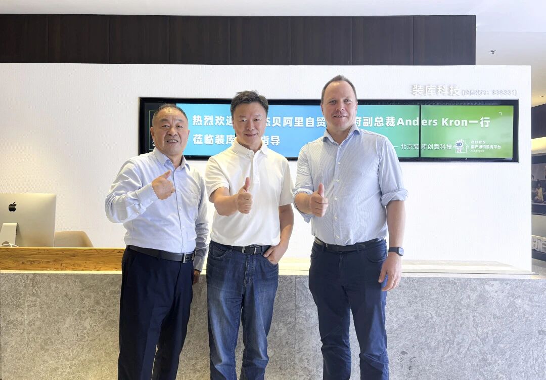 9月15日,阿联酋迪拜杰贝阿里自贸区政府业务发展部副总裁 Anders Kron (右)与中国市场高级主管胡胜利(左)一行到访装库科技总部。双方就数字家居产业国际化布局、中阿经贸合作与供应链协同发展等议题进行了深入交流。装库科技董事长王敬(中)携公司管理团队出席接待。