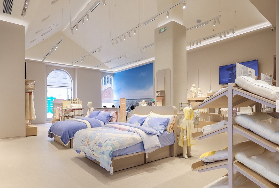 二层专注于全家人的贴身呵护,从内衣内裤、保暖衣物到家居服饰,以天然棉花的柔软质感诠释“家的温度”;顶层则为0-2岁孕产及新生儿用品、家居床品的专属天地。空间内贴心设置儿童游乐区、温馨哺乳间及育婴室,营造轻松愉悦的亲子氛围。