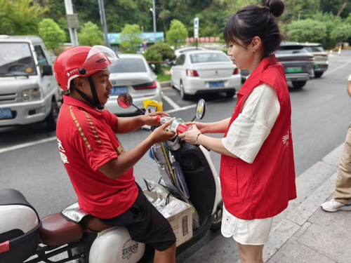 图为香溢志愿者为外卖小哥“送清凉” 胡翀 摄