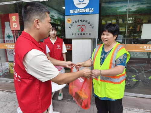 图为香溢志愿者给环卫工人发放生活物资 胡翀 摄