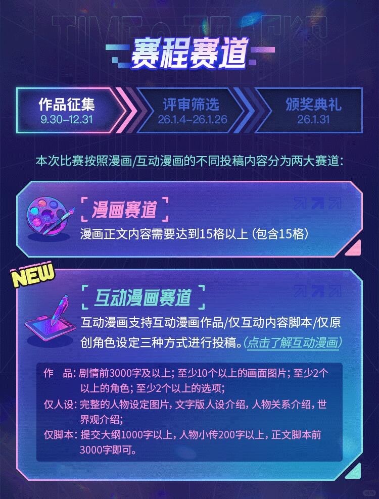 本届大赛在延续以往原创条漫赛道的基础上,首次增设互动漫画赛道,支持创作者以互动漫画作品、互动内容脚本、原创角色设定三种形式投稿。这一创新举措显著拓宽了参赛作品的类型与表现形式,进一步鼓励内容多样性和技术融合,为漫画创作注入全新活力。