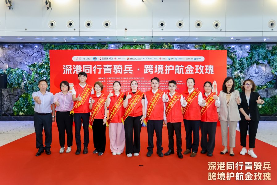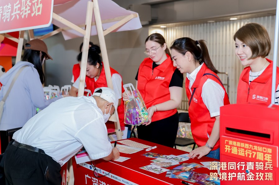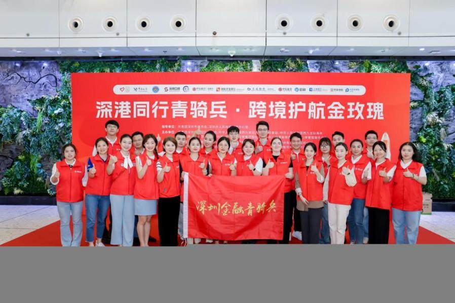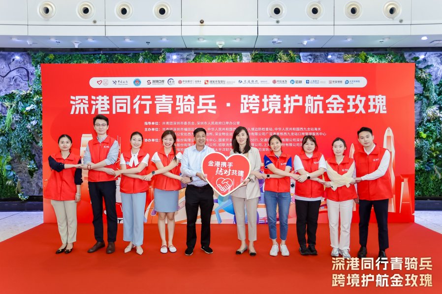 在第十五届全国运动会即将开幕和广深港高铁西九龙站口岸开通七周年的重要时刻,由共青团深圳市委员会、深圳市人民政府口岸办公室指导,共青团福田区委员会、西九龙边检站、海关、派出所、深业运营等单位联合主办,中信银行信用卡中心联合国家开发银行深圳市分行、交通银行深圳分行、中信证券深圳分公司、招联消费金融、上海银行深圳分行、华安财产保险、中国太平洋财产保险深圳分公司8家金融机构共同参与的“深港同行青骑兵·跨境护航金玫瑰”主题金融志愿服务活动于2025年9月19日在香港西九龙站口岸成功举办。