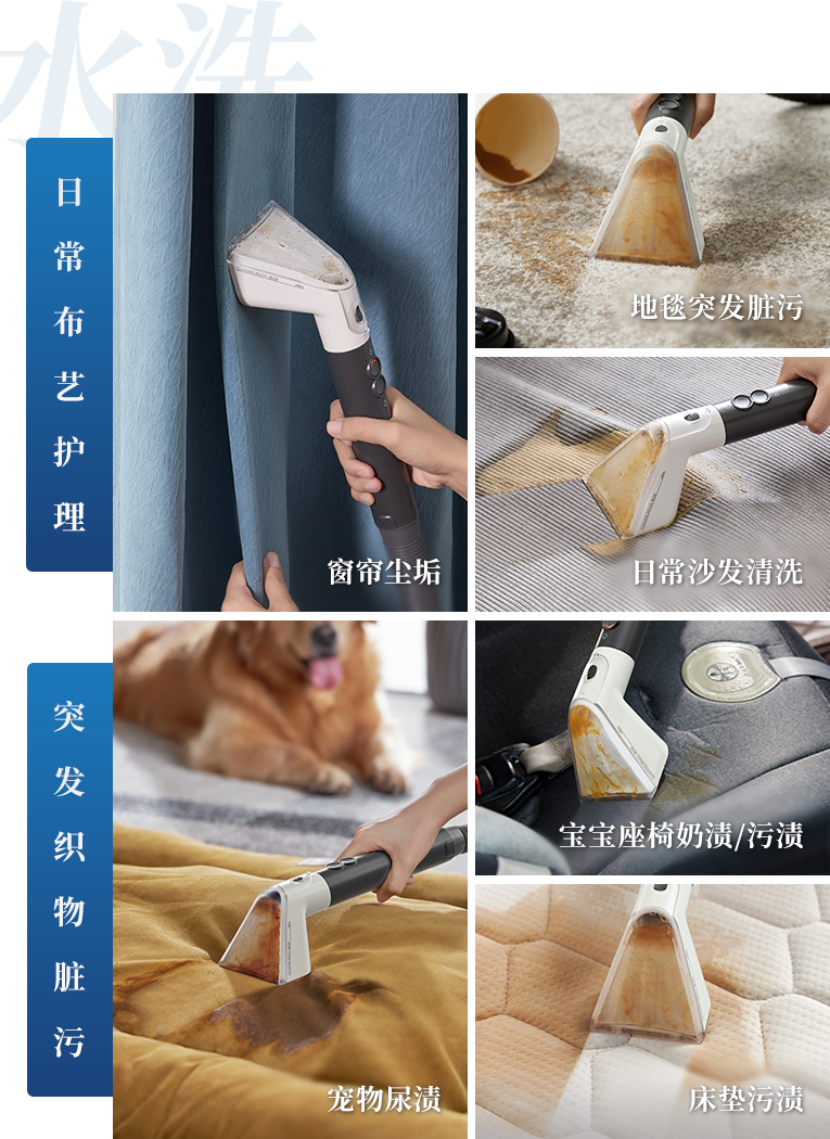 难以对布艺深度清洁一直是家居清扫的难点——普通吸尘仅能清理织物的表面灰尘,水洗又难干易留渍,蒸汽单蒸无法即时抽走污水。