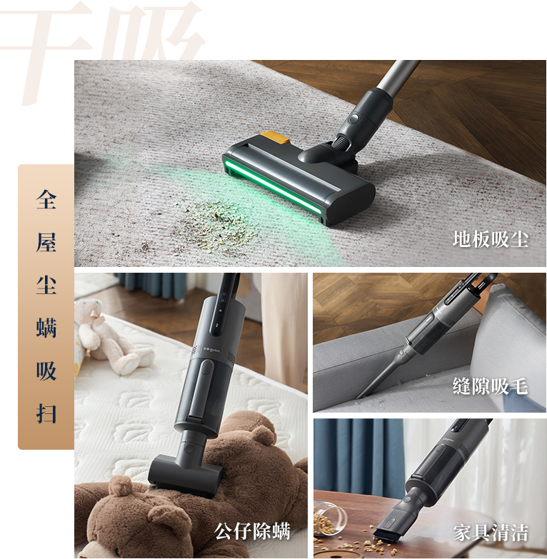 东菱无线全屋清洁机采用“1+3吸头配件组合”,轻松覆盖全屋吸扫场景:软绒地刷专为地毯与硬质地面设计,其搭载的140°绿光显尘+防毛发缠绕功能,吸扫灰尘更高效;除螨刷可对床褥、公仔进行除螨清洁,孩子日常接触更安心;扁吸嘴轻松深入窗轨、沙发缝等狭窄区域,清除积尘不伤家具;柔软毛刷适用于桌面、电子产品等,除尘护理同时防止刮花。实现从地面到缝隙、从织物到家具的全方位洁净。