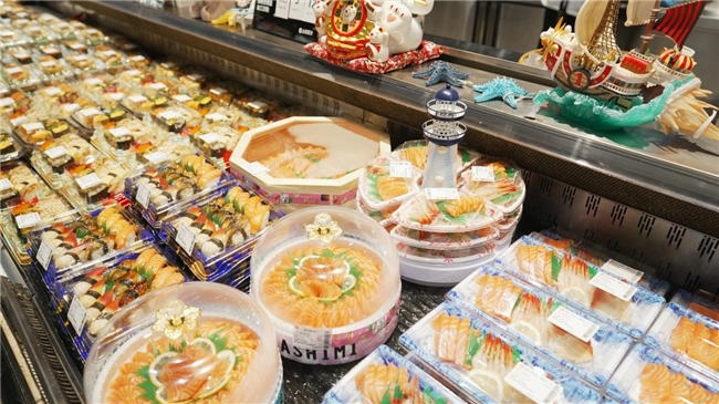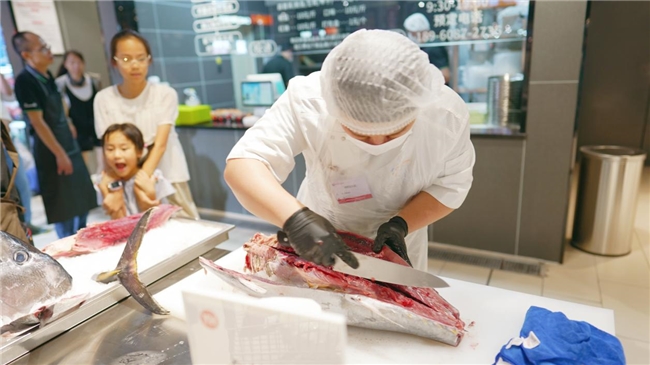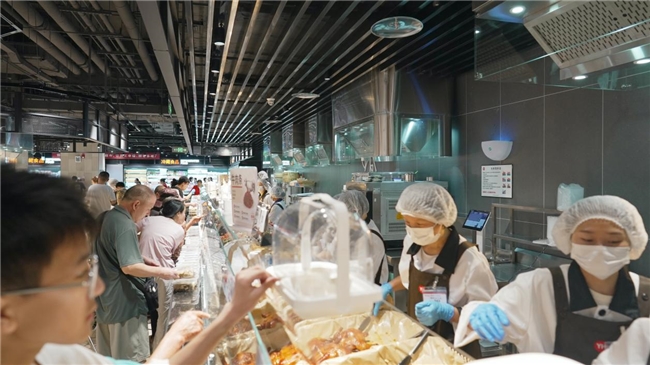 门店环境全面升级,采用“通透设计”理念,中岛货架齐肩高度让视野一览无余,通道大幅度拓宽。特别值得一提的是“海鲜厨房”创新场景,集活鲜展售、加工烹饪与堂食服务于一体,消费者可现场挑选海鲜并由厨师代工清蒸或香煎,即刻享用现烹美味。这一场景化体验精准契合了游客和年轻群体对即时、新鲜、互动式消费的追求。