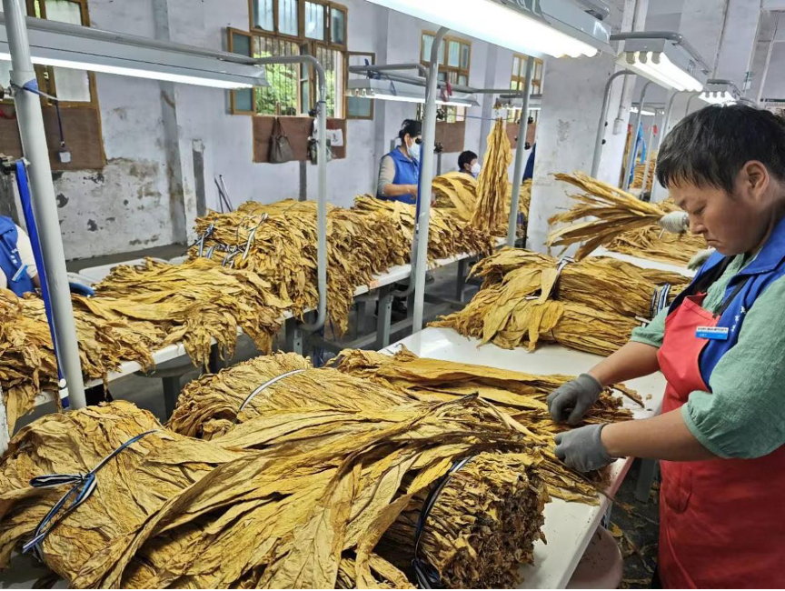 “向大哥,您这捆烟叶分级规范,‘打小捆’做得扎实,纯度高,等级错不了!”在专业化分级区,技术员黄师傅仔细查验烟农向大哥送来的烟叶,当场给出好评。