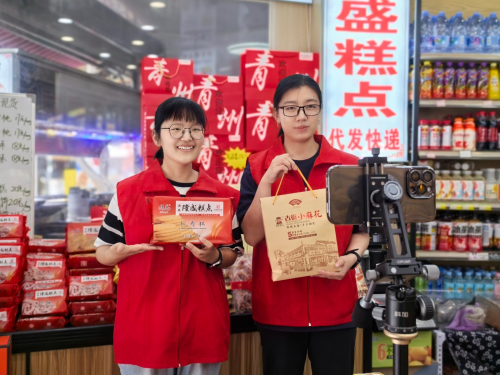 “家人们看过来!手里这款风干鸡,是咱青州传承三十年的老字号特产,肉质紧实有嚼劲,开袋就能吃;再配上这个印着鲁超赛事 Logo 的文创足球钥匙扣,既有地方味儿又有赛事范儿!” 青州市局(分公司)“青小烟”志愿服务队在古街深处的特色零售店,和店主一起进行线上直播。