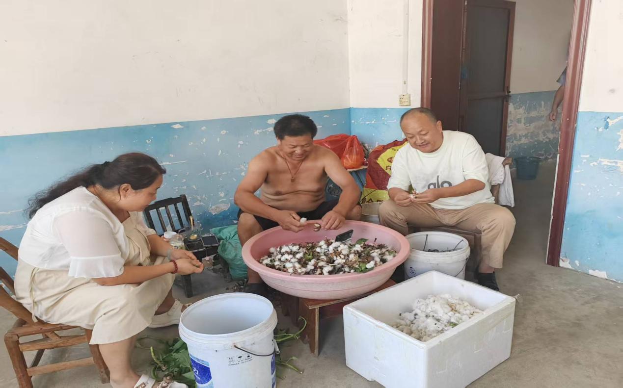 (图为蕲春县烟草专卖局驻村工作人员帮助群众剥棉花)