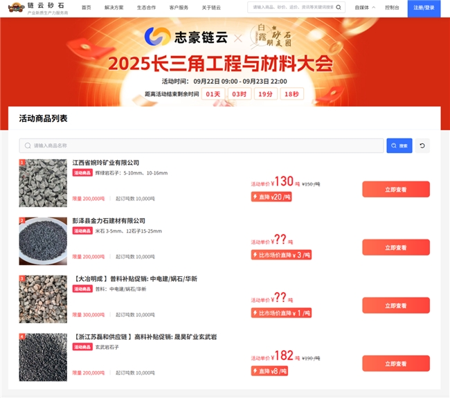 发布会现场,链云砂石平台的线上销售能力迎来首次实战检验,平台集中推出高标辉绿岩、赤峰玄武岩、江西普高料、高标天然砂等各类优质砂石产品,依托平台创新灵活的交易模式与高效的供需匹配机制,现场线上支付意向金锁单货量达 94万吨。这一成绩不仅刷新了行业单次线上砂石销售纪录,更以 “5 分钟完成传统模式下商家 1 个月销售量” 的效率,直观展现了数字化平台对传统砂石销售模式的颠覆性改变,彻底打破了以往砂石交易中信息不对称、流通效率低的痛点。