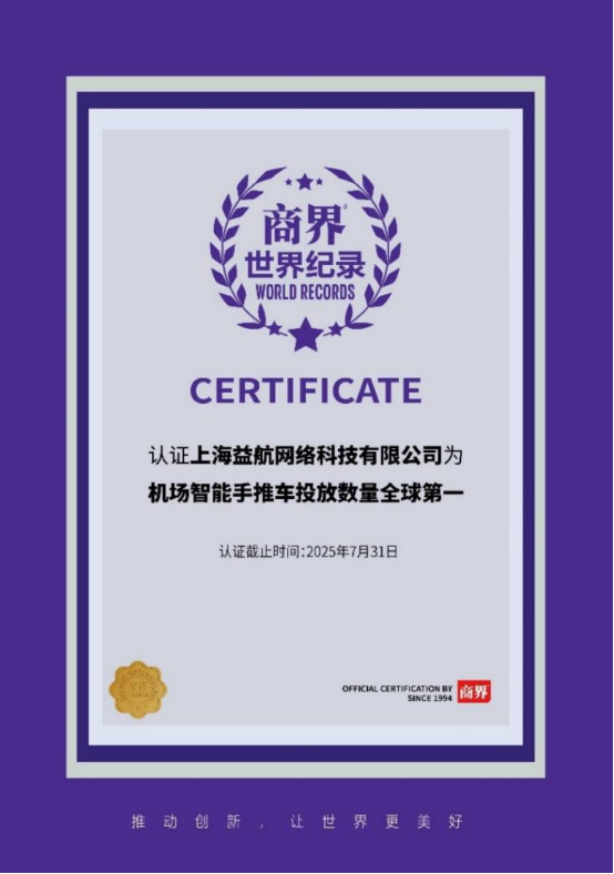 上月,上海益航网络科技有限公司(以下简称“益航科技”)旗下产品“航旅小U(USMT)”智能手推车,荣获重庆商界传媒颁发的“全球机场智能手推车单一品牌投放数量最高”世界纪录认证,标志着益航科技在全球智慧机场数字化运营领域实现关键突破,为行业树立了新的标杆。