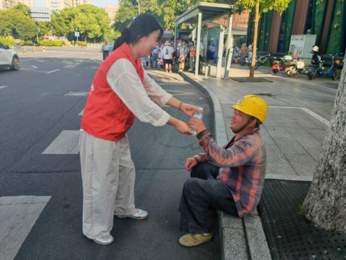 图为香溢志愿者为驿站附近户外劳动者送上矿泉水