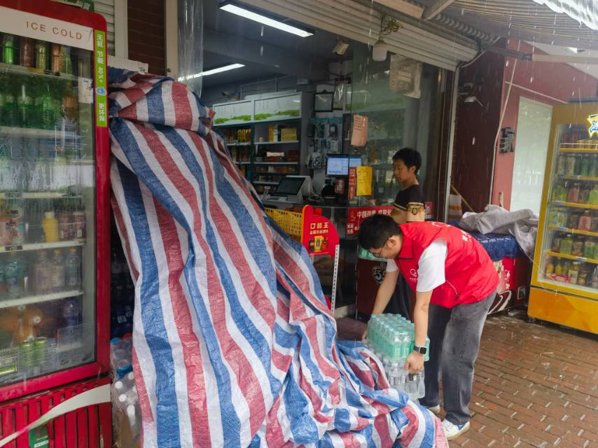 挂断电话,许江鸿和同事们组成“香溢”志愿者,立即上门协助。他们帮助店主将摆在店外的冰柜、货物迅速搬移至室内安全位置;仔细检查店招是否牢固、排水通道是否畅通,发现隐患立即协助加固处理。同时,他们还在店内醒目位置设立“香溢爱心角”,备好雨伞和应急电源,供消费者免费借用。“有需要您随时找我们,我们一直都在!”志愿者周陈贵边忙边叮嘱老板。