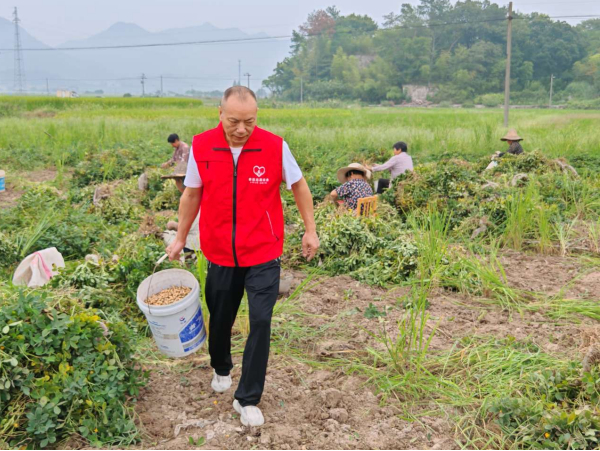 图为天台烟草“香溢”志愿者帮助抢收花生。