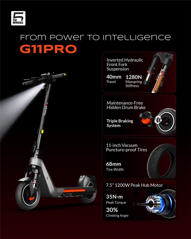 北京时间9 月 24 日晚,英凡蒂(INVANTI)科技有限公司在美国加州正式发布 5TH WHEEL 品牌全新旗舰电动滑板车 G11PRO。新车围绕“The Next-generation Escooter”的理念,将原本属于下一世代的动力、悬架与智能体验一次性带到 500美元的主流价位,目前已在5TH WHEEL独立站开启预售。