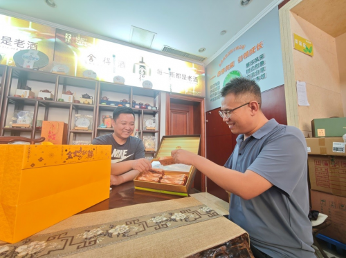 图为客户经理安丰秋(右)为零售户搭配特色礼盒