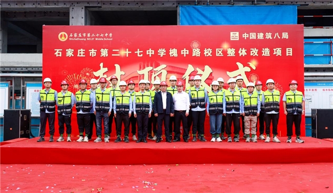 9月27日,在建设单位、项管单位、监理单位及项目相关管理人员的共同见证下,中建八局发展建设公司承建的石家庄市第二十七中学槐中路校区整体改造项目顺利完成主体结构封顶,标志着项目建设取得阶段性重大成果,正式转入二次结构与装饰装修施工新阶段。