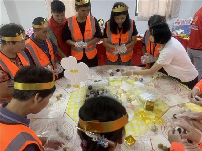 为了迎接即将到来的国庆中秋双节,一群身着橙色反光背心的环卫工人头戴金色纸皇冠,围在一张摆满做月饼的食材和工具的桌子旁,在糕点师傅的指导下认真地学习制作冰皮月饼。桌上散落着各种材料,大家专注地看着桌上的物品,脸上洋溢着参与的喜悦。