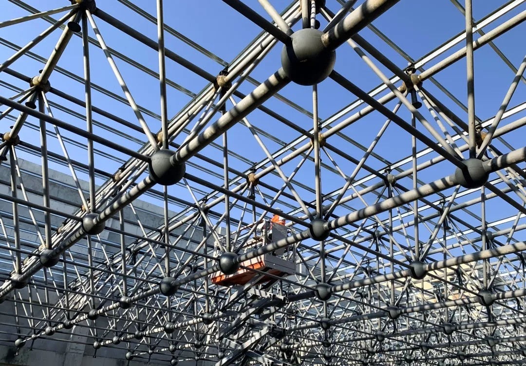 分公司技术团队积极探索高寒高海拔地区大面积焊接球网架施工工艺,创新网架拼装技术,利用网架拼装专用辅助支架、简易爬梯和高空作业用便捷通道,有效提升网架施工效率,对于环境因素产生的累积偏差实现有效控制。产出“一种用于地面拼装钢结构网架的辅助支架”等3项2025年新授权实用新型专利。