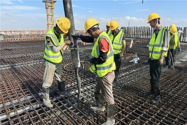 项目经理聂文亮介绍到:“为满足公铁双层结构荷载与精度需求,采用钢管柱+盘扣支架组合体系,搭配等载预压与轴力计监测,消除非弹性变形并捕捉弹性变形数据以保障支架稳固,关键环节用定位卡具提设备安装精度,混凝土浇筑推行“分层浇筑、循序推进、一次成型”方案,层层把控实现结构与质量双保障。”