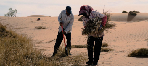 手上磨出了血泡,就用布条缠紧;膝盖跪得生疼,就垫上一块旧棉垫。老把式教她要看风向,斜着压草才吃得住劲,她默默记下,反复练习,从生疏到熟练,从缓慢到利落。日复一日、年复一年,春天的风依旧凛冽,却再也吹不散她扎下的草格,15年来她参与治沙的面积超过百亩,绿色在沙漠中不断延伸。