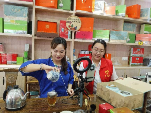 图为助力少数民族零售户直播销售茶叶(柳州市三江侗族烟草专卖局 覃永乐 摄)