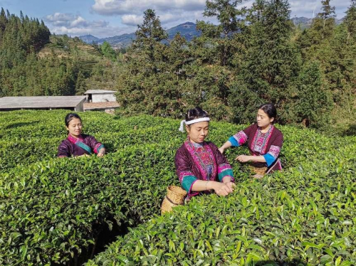 图为荣军连(中间)在茶园采茶叶(柳州市城区烟草专卖局 郭晓燕 摄)