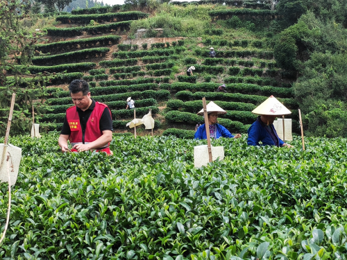 图为柳州烟草驻村队员帮助村民采摘茶叶(柳州市烟草专卖局 韦宇雄 摄)