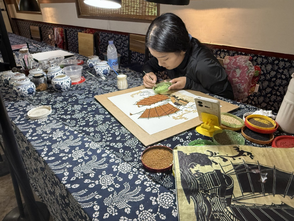 图为队员在馆陶粮画小镇学习粮画传统技艺