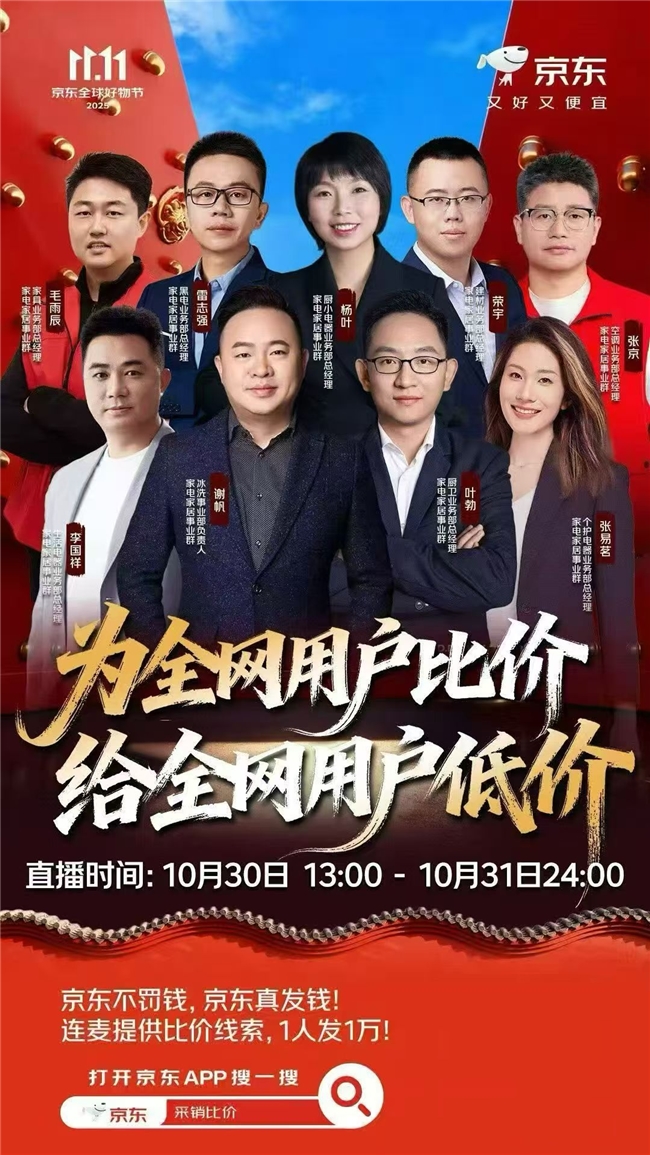“如果发现其他平台比京东价格更便宜?马上来直播间连线我们!”10月30日13点,“京东家电家居采销比价值班间”正式拉开帷幕。京东更以100万元现金发起“比价悬赏令”,号召全网用户网友可用京东自营家电价格,比价其他平台品牌官方旗舰店、品牌直播间同款产品。如发现京东价高,则可进入直播间申请与主播连线提供低价线索,京东将会给予10000元奖励,以京豆形式发放,并现场调价至9折优惠,部分商品更会以5折价格在直播间限量抢购。网友打开京东App搜索“比价直播”“家电家居5折”即可分别进入比价直播间及会场,参与全民比价。