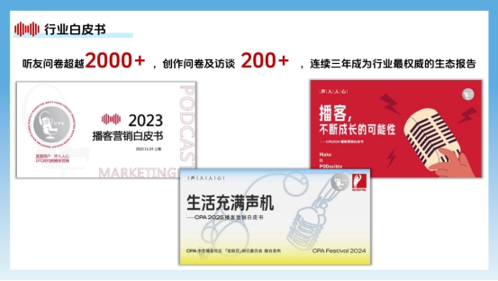 除了发掘宝藏播客,推动播客商业化,建立健康、可持续的内容生态是CPA中文播客社区设立初始的另一大初衷。为此,从2022年起,CPA每年会在年底发布面向新一年行业和市场的播客白皮书,通过广泛的调研、访谈、研究,向市场展现行业基本面、用户特征与洞察、创作者与品牌主的最佳实践,勾勒海内外播客市场的下一步发展趋势。