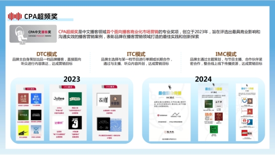 除此之外,CPA还通过业内首个面向播客商业化市场营销的CPA超频奖,表彰品牌在播客营销领域打造的最佳实践和创新探索。