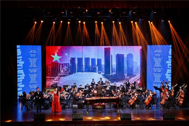 下半场,华东师范大学交响乐团以专业实力扛起演出重任。在青年教师张栩嘉的指挥下,乐团以《魔笛》序曲奏响华章;学生殷世炎、郑亦栩的经典歌剧选段二重唱韵味悠长;乐团与刘明康合作的《微笑的乔伊》《水边的阿狄丽娜》等钢琴与乐队作品意境深远。随后,男高音歌唱家韩蓬与刘明康联袂献唱《我的太阳》,乐团演绎的《瑶族舞曲》热情奔放,学院声乐教师高凌媛的《帕米尔,我的家乡多么美》高亢嘹亮,最终在《钢铁洪流进行曲》的铿锵旋律与《我爱你,中国》的深情二重唱中推向高潮,全方位展现了国家一流师范大学艺术教育的扎实成果与师生的昂扬风采。