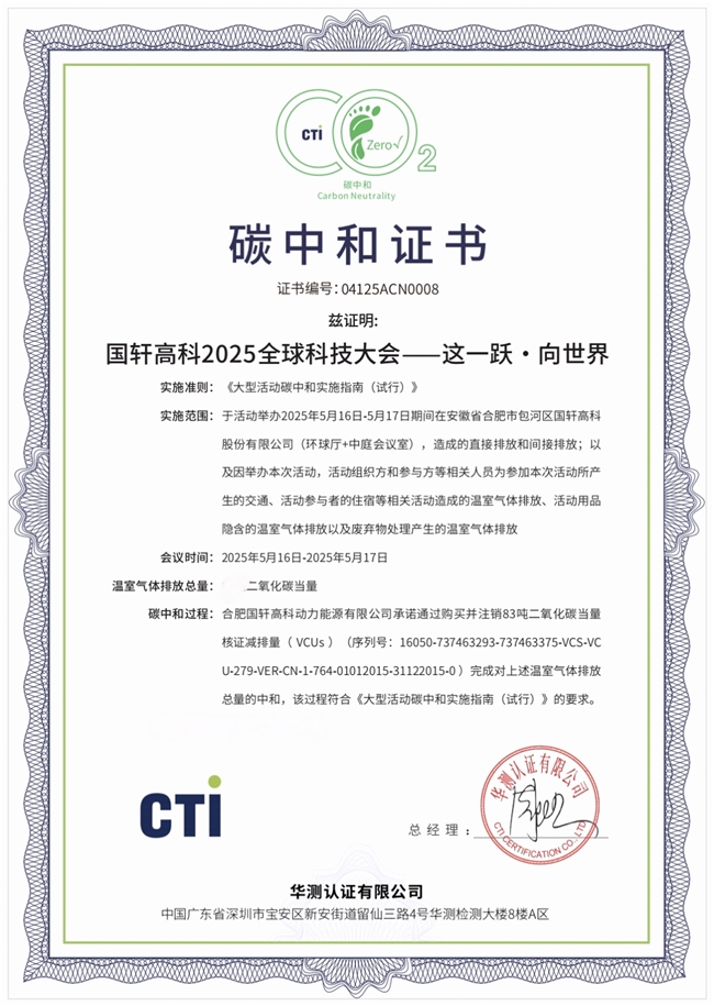 作为科技创新的践行者,国轩高科将绿色发展理念深度融入大会全流程。大会严格遵循《大型活动碳中和实施指南(试行)》,通过全链条减排措施与闭环式碳中和管理,最终获得CTI认证碳中和证书,为国轩高科在大型活动低碳化运营上增添亮眼成绩。